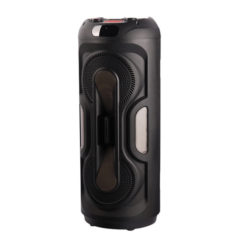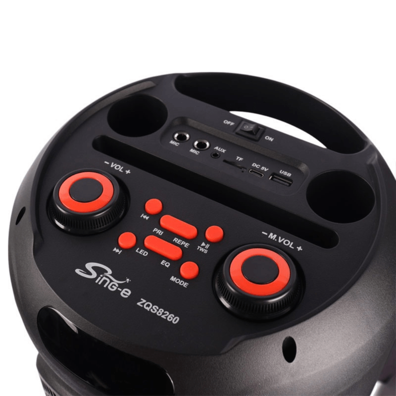 PARLANTE PORTATIL KARAOKE SING E ZQS8260 parlante doble con woofers de 8 pulgadas y tweeter integrado sonido potente para fiestas y karaoke incluye microfono luces led y control remoto POTENCIA salida estimada de 40 w reales con picos de hasta 100 w pmpo BATERIA bateria recargable de 3000 mah autonomia aproximada entre 4 y 8 horas segun uso CONECTIVIDAD bluetooth 5 usb tarjeta sd tf entrada auxiliar 3 coma 5 mm radio fm funcion tws para vincular dos equipos FUNCIONES luces led rgb sincronizadas con la musica entrada de microfono con prioridad de voz control remoto panel superior de manejo DIMENSIONES 28 coma 5 por 28 coma 5 por 68 cm peso estimado 5 coma 5 kg ACCESORIOS INCLUIDOS microfono con cable cable de carga control remoto manual de usuario